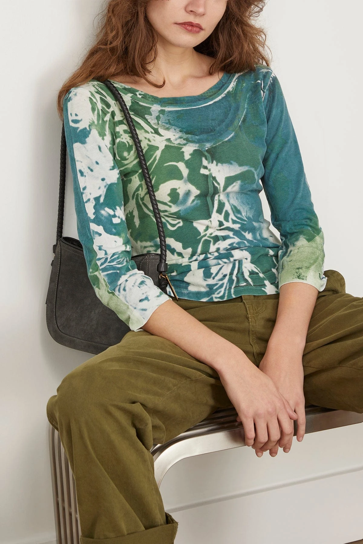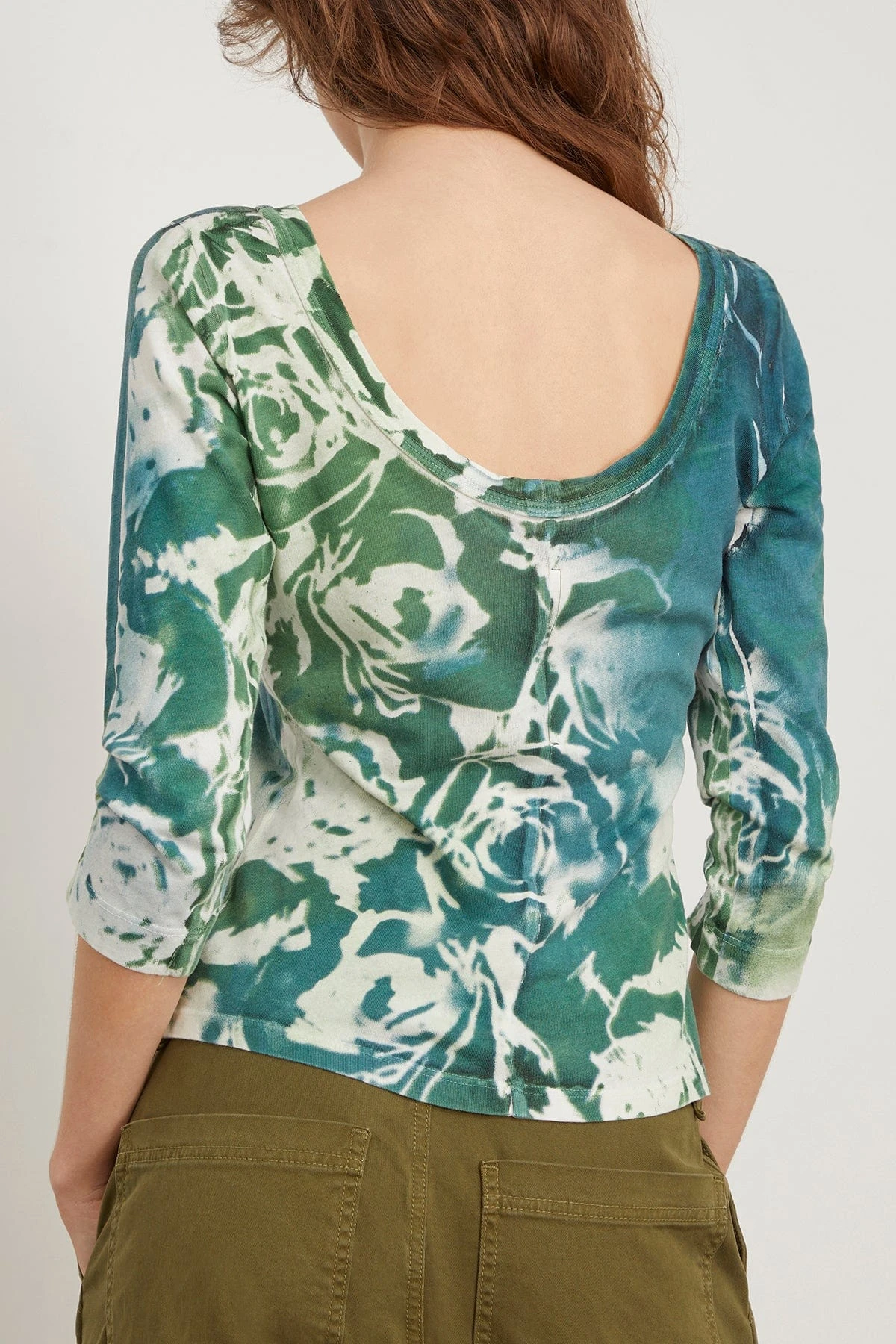 The Raquel Allegra Bryony Top in Teal Army Rose is a 3/4-sleeve boatneck top crafted in the RA classic jersey. This style is a layering-friendly basic tee in this season’s teal-to-army floral tie dye rose design. We love it worn with jeans and booties.