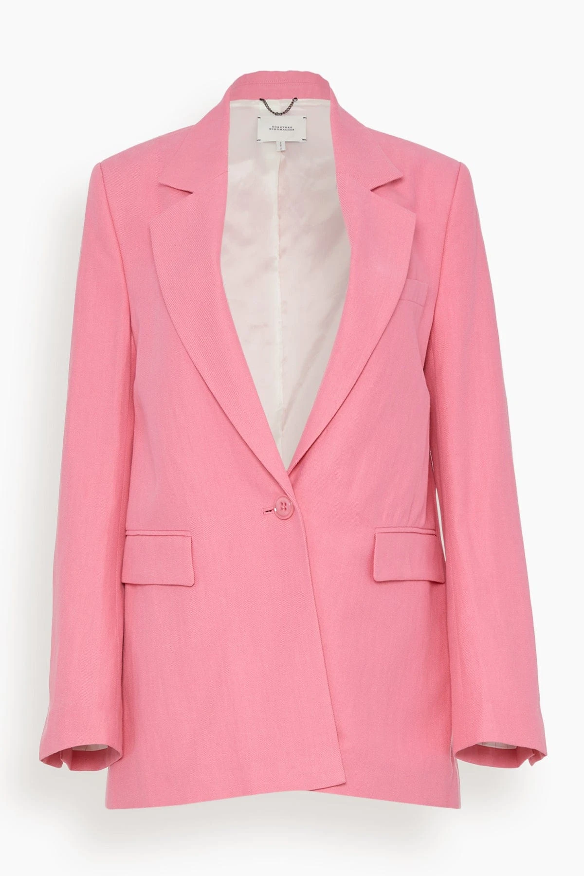 The lightweight blazer is crafted in a cooling mix of cotton and linen, and comes together with a single button closure. The style has a slight A-line drape, which makes it ideal for wearing open.