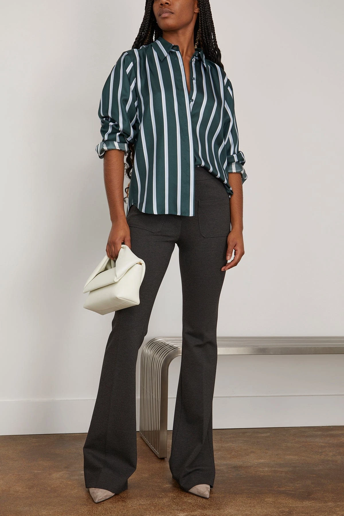 The pants are made of soft Punto Milano. The narrow leg comes in a bootcut design.
