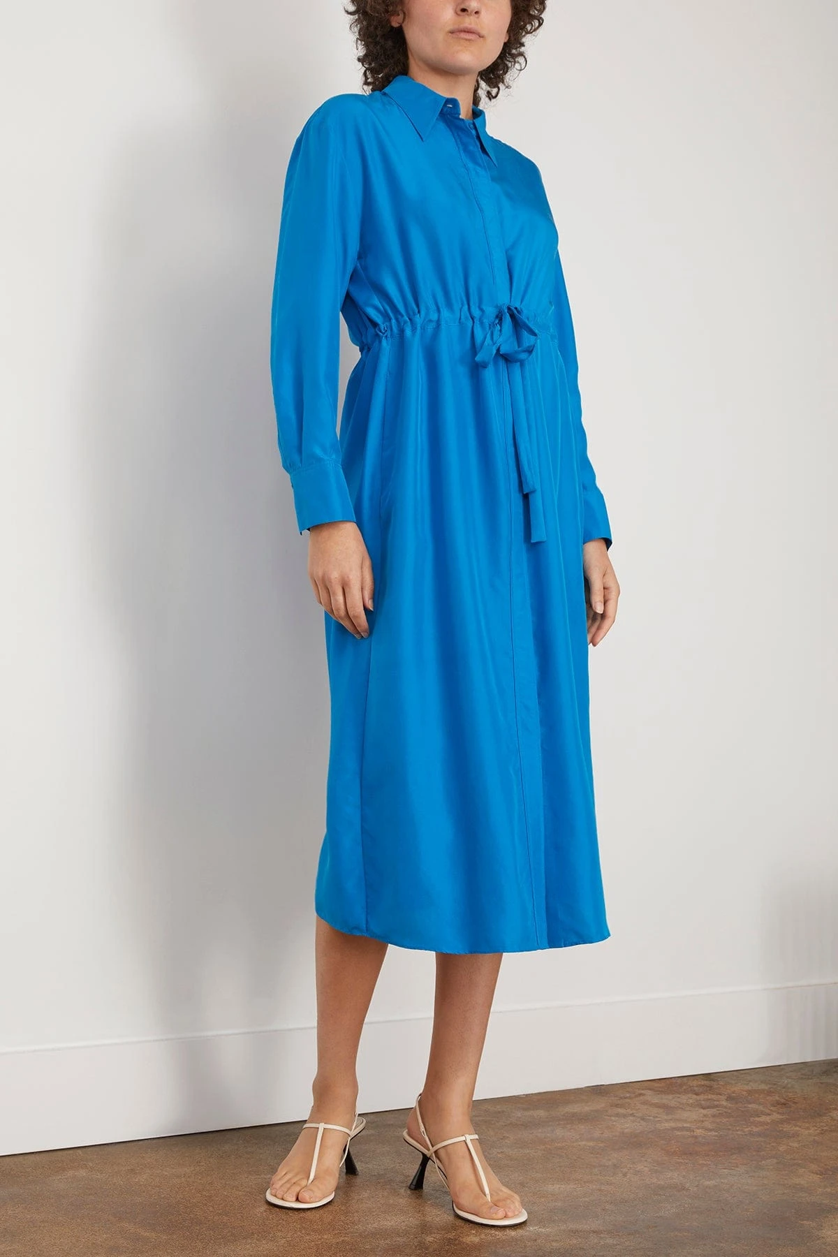 The Dorothee Schumacher Heritage Ease Dress in Aqua Blue is a washed silk shirtdress that is styled with a drawstring waist. It has a concealed button placket on the front and the back of the dress has a round cutout at the top of the waist, which can be adjusted by ties. We love it paired with heels and a clutch.