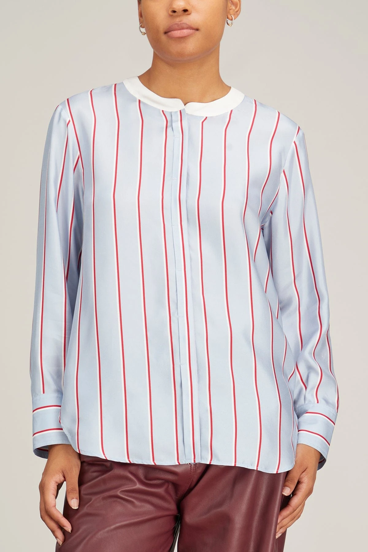 The blouse is made of flowing silk and features a striped print. The large cut-out on the back is tied with a knot.