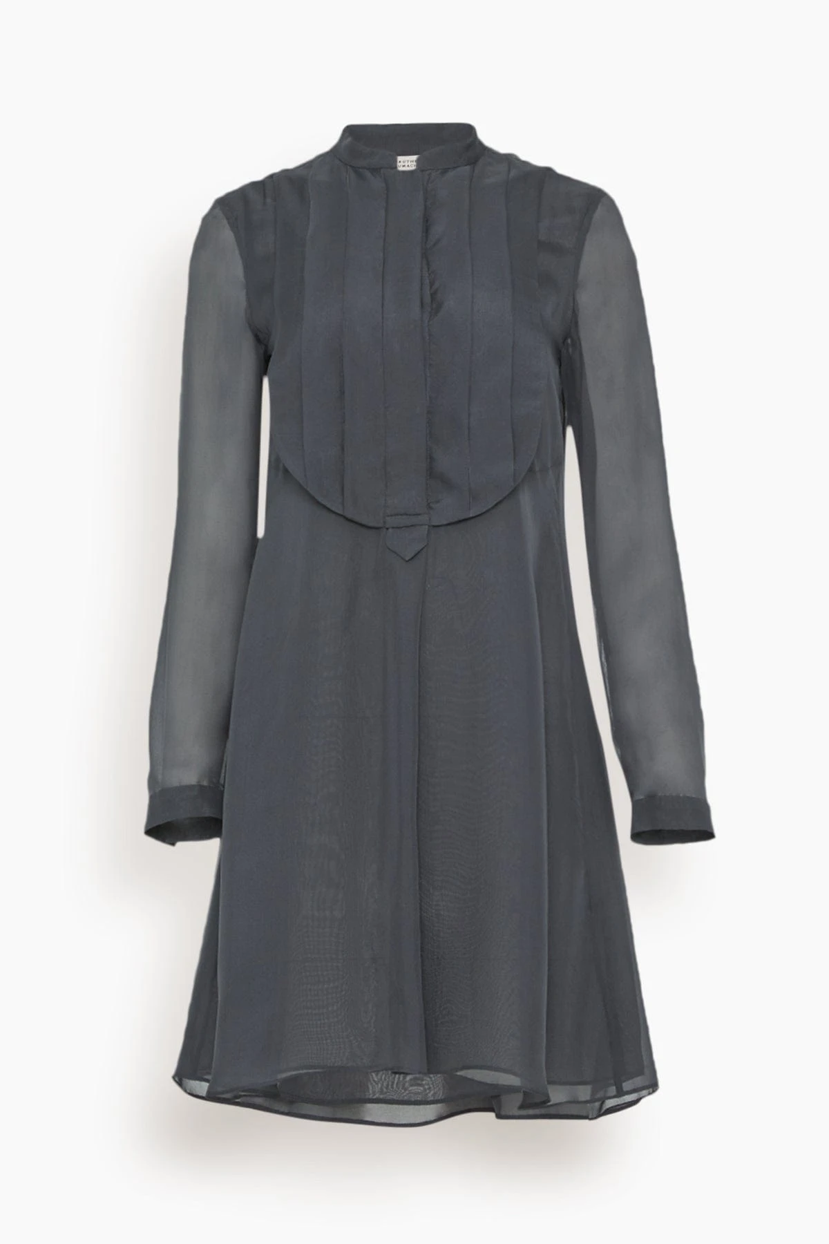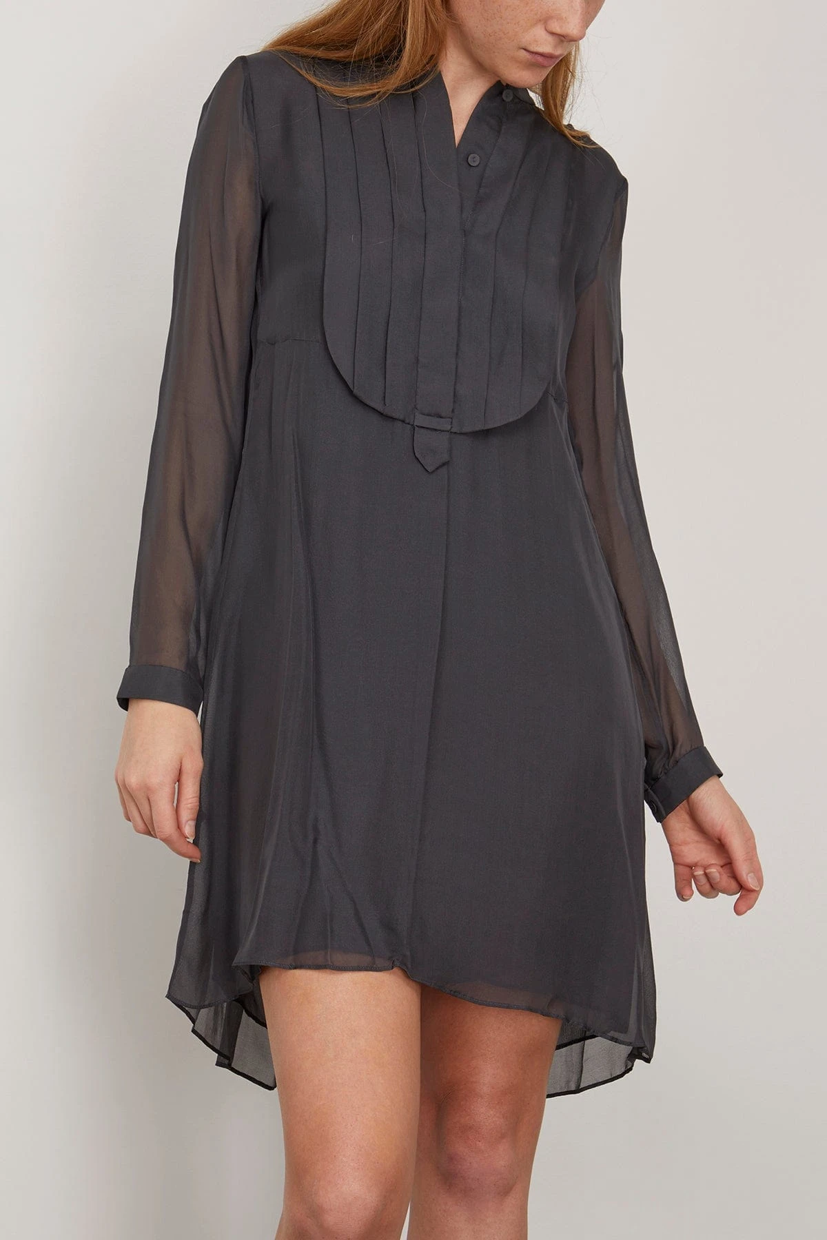 The silk dress has a relaxed, flowing silhouette. The inset plastron is loosely attached and enhanced by a button placket. Pleats on the back complete the look.