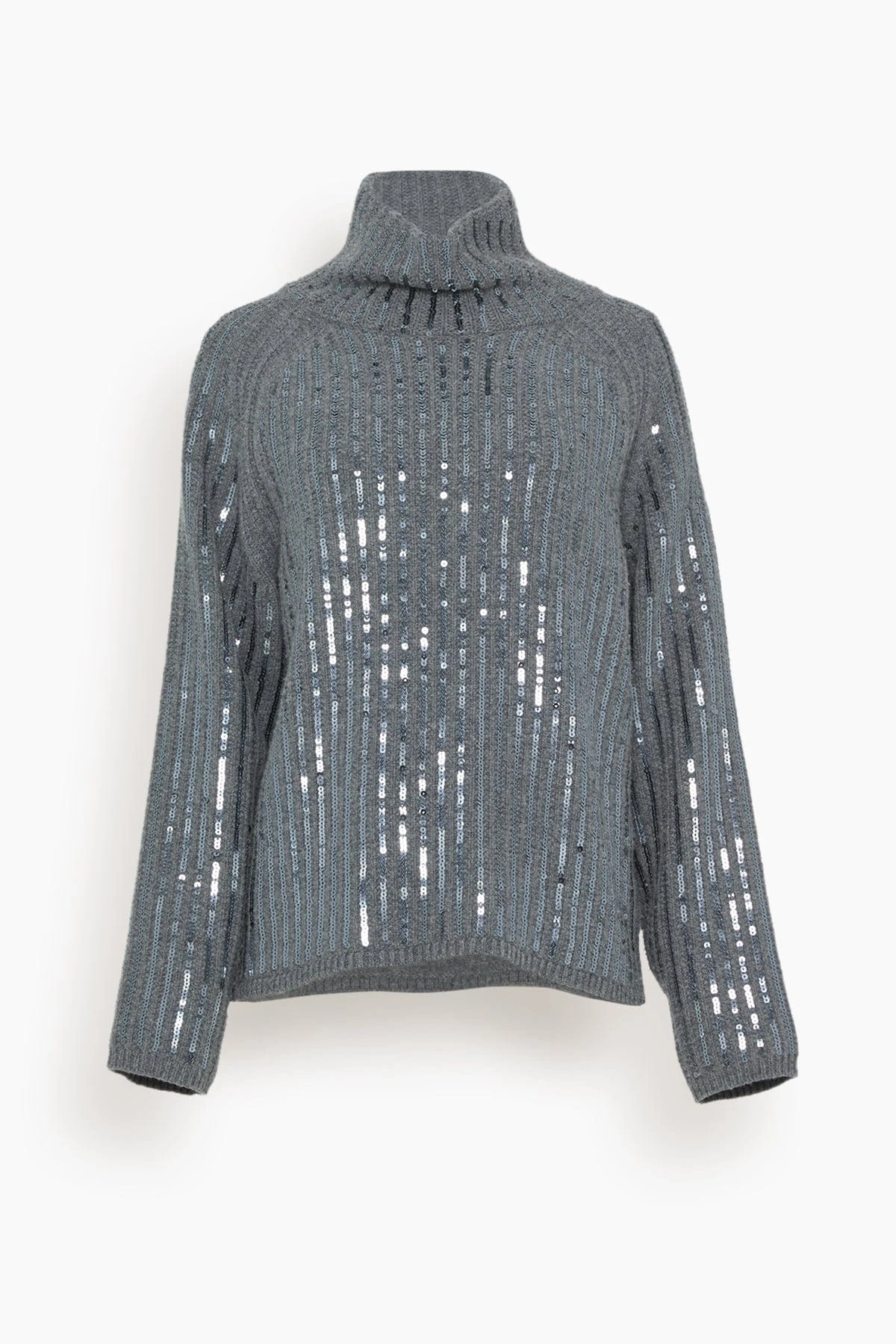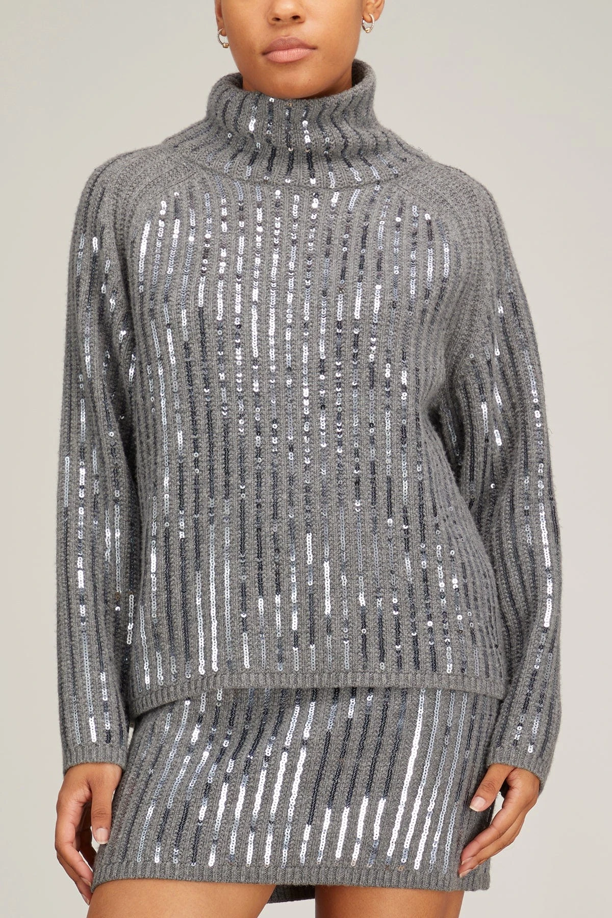 The turtleneck sweater is made of merino and cashmere. It feels incredibly soft against the skin. The sweater is embellished with rows of sequins.