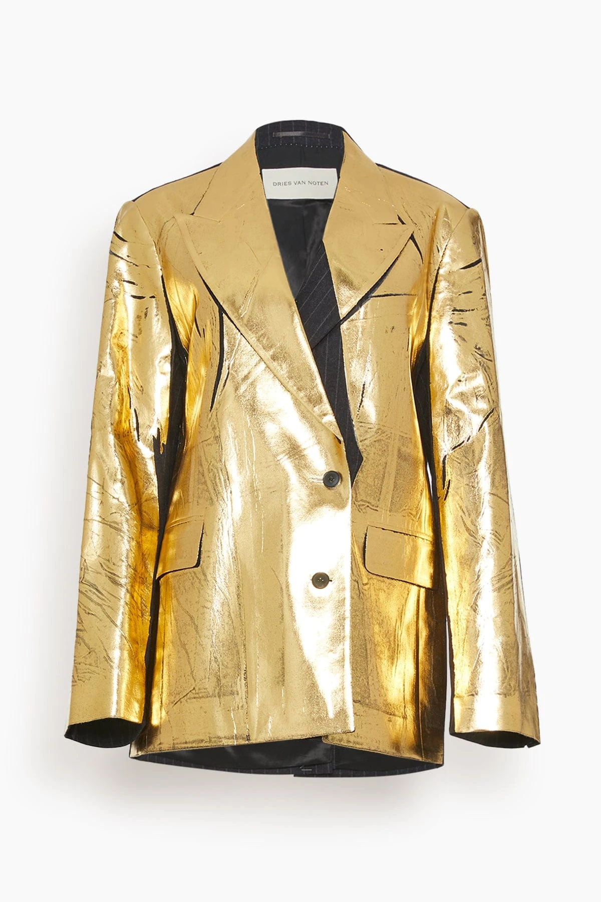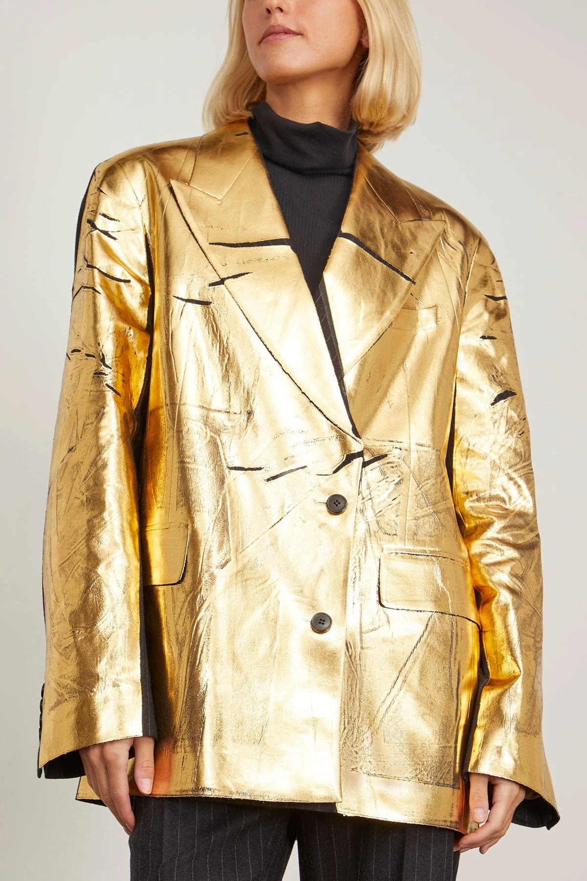 The Dries Van Noten Benos Jacket in Ant is a laquered blazer with pinstripe back combo. We love this flashy jacket with a slip dress and heels.