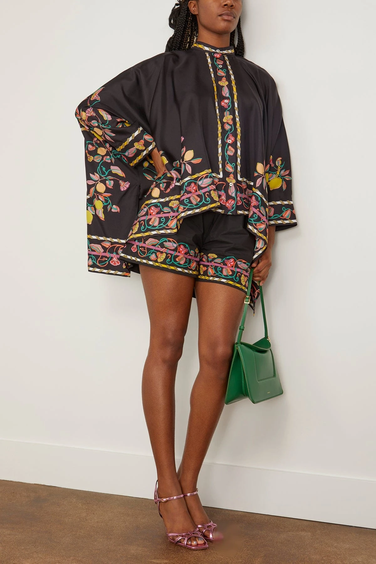 Is it a shirt? Is it a scarf? Actually, this beauty is a little bit of both. La Double J has nattily transformed an Italian-made silk square scarf into a shirt design that looks great on all shapes and sizes thanks to its waterfall style fit. The fuss-free silhouette drapes off the arms with a cute Korean collar you can button up or let loose. It arrives fresh for the summer season strewn with lucky peppers and lemons in this Naples-inspired print designed by the LDJ team and placed by hand.
