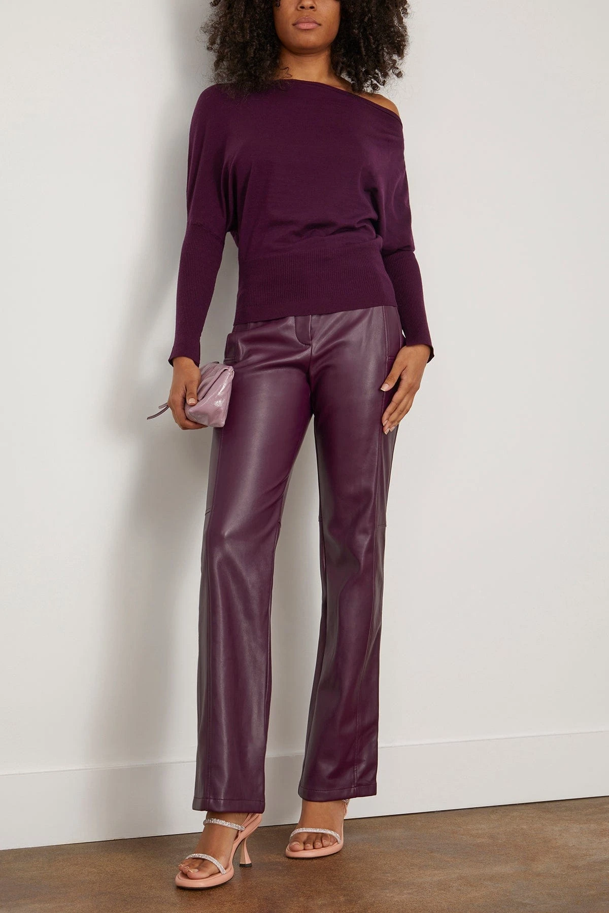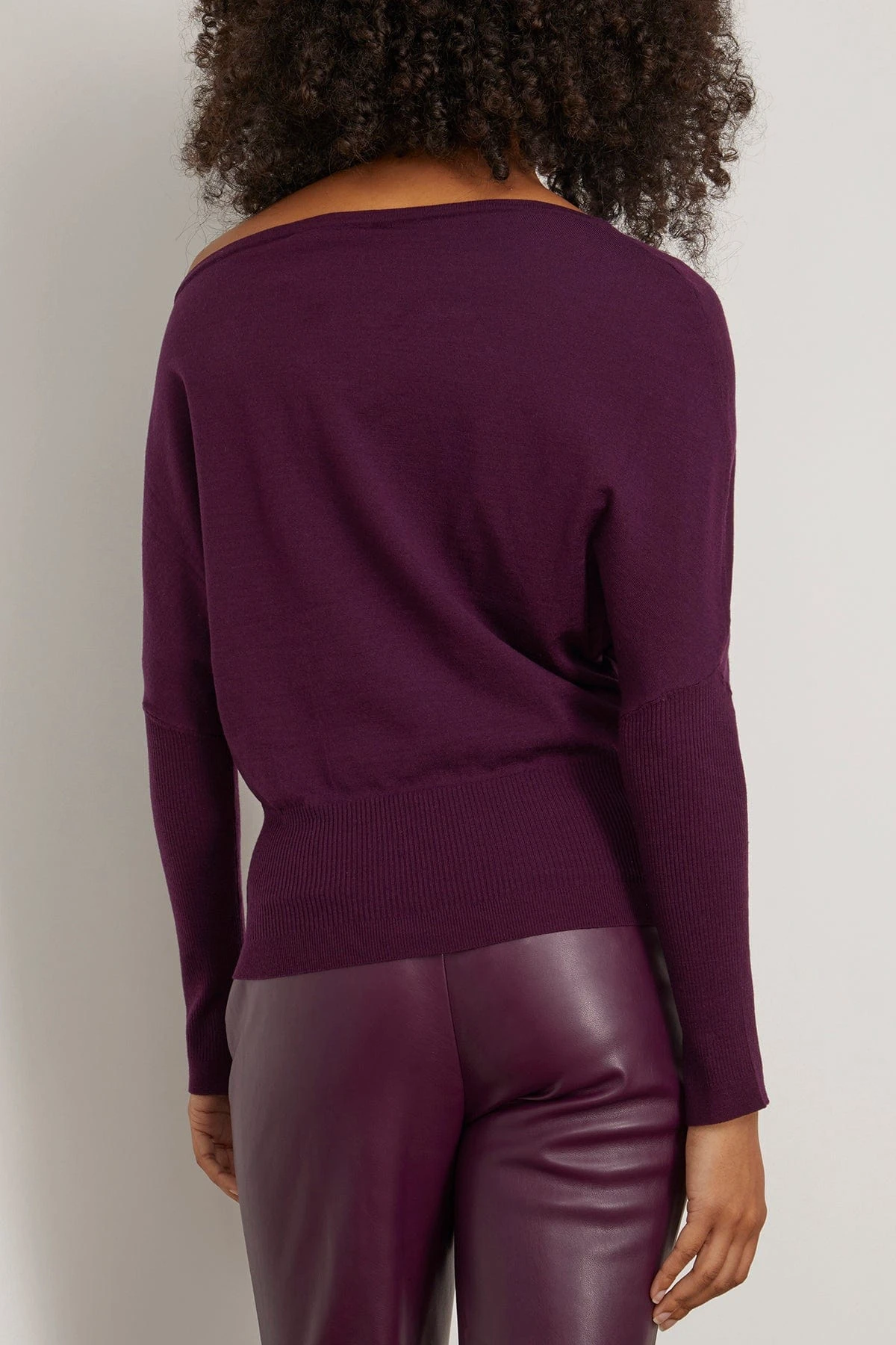 The Simkhai Lavina Draped Off Shoulder Sweater in Plum is crafted with an asymmetric neckline and a draped design. We love this chic sweater with jeans and loafers.
