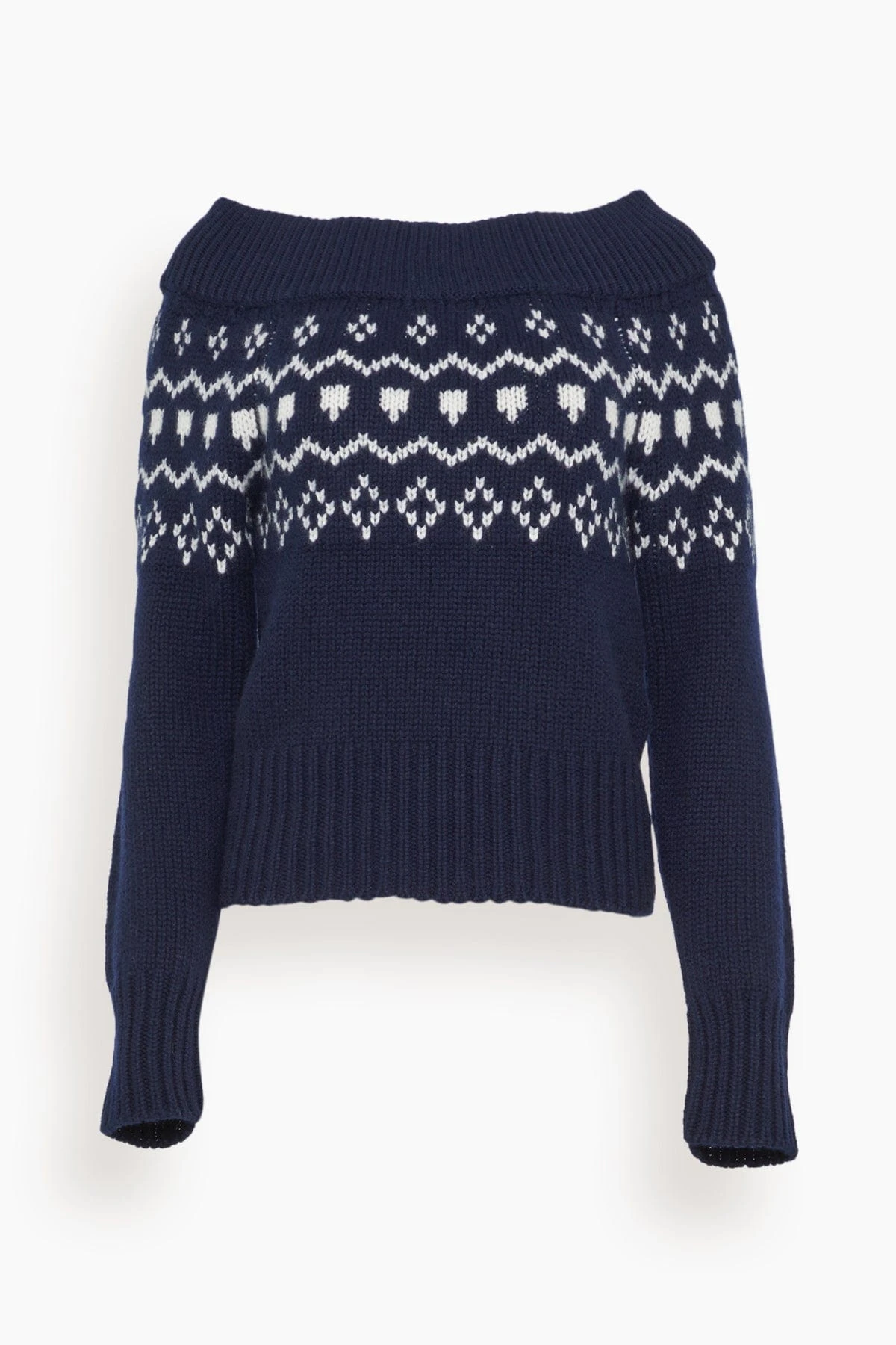 The Lisa Yang Philia Sweater in Navy/ Cream Jacquard is an inspired knit from traditional Scandi knitwear. This off-the-shoulder style is knitted from soft cashmere. We love this style paired with jeans and loafers.