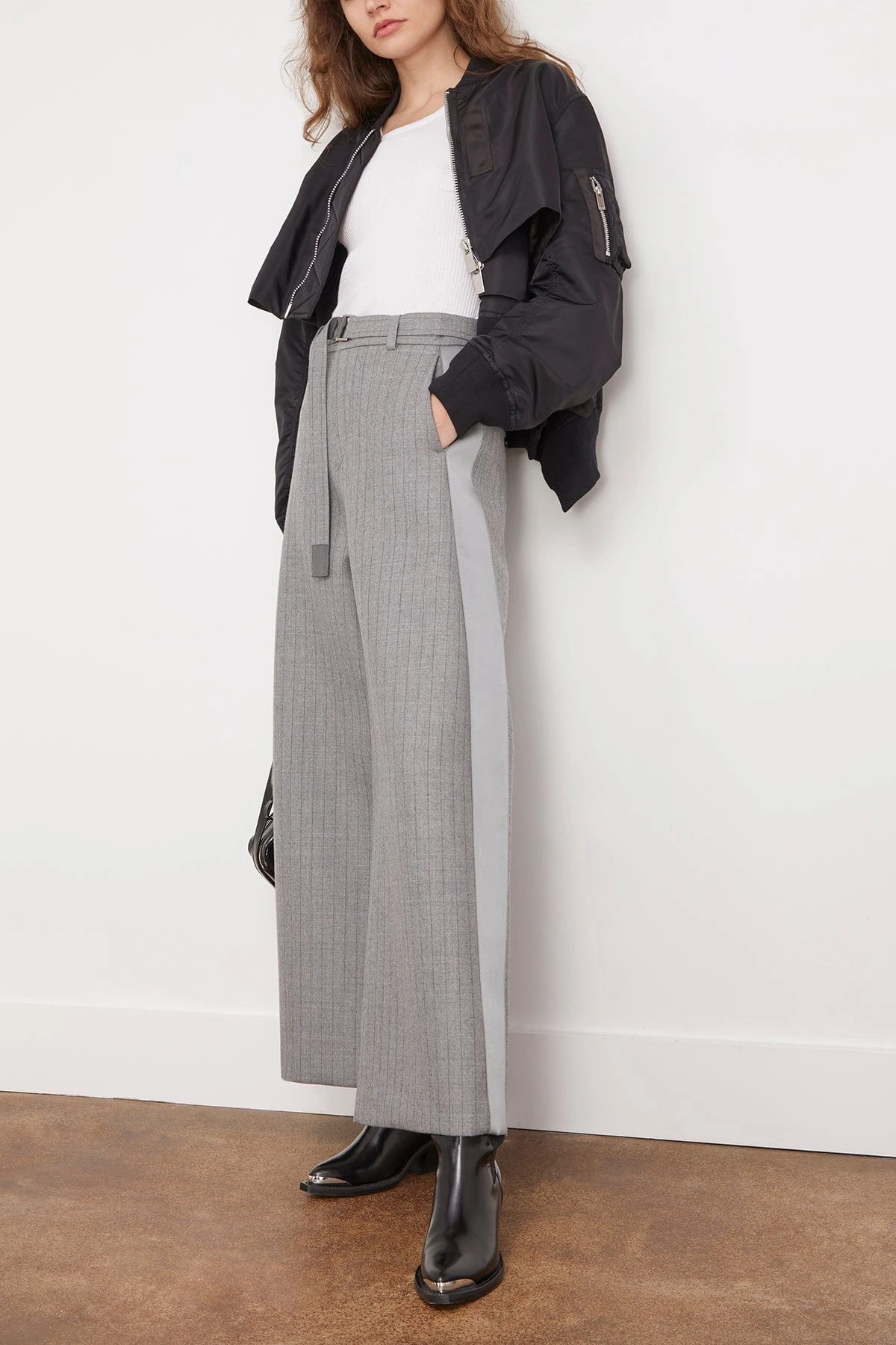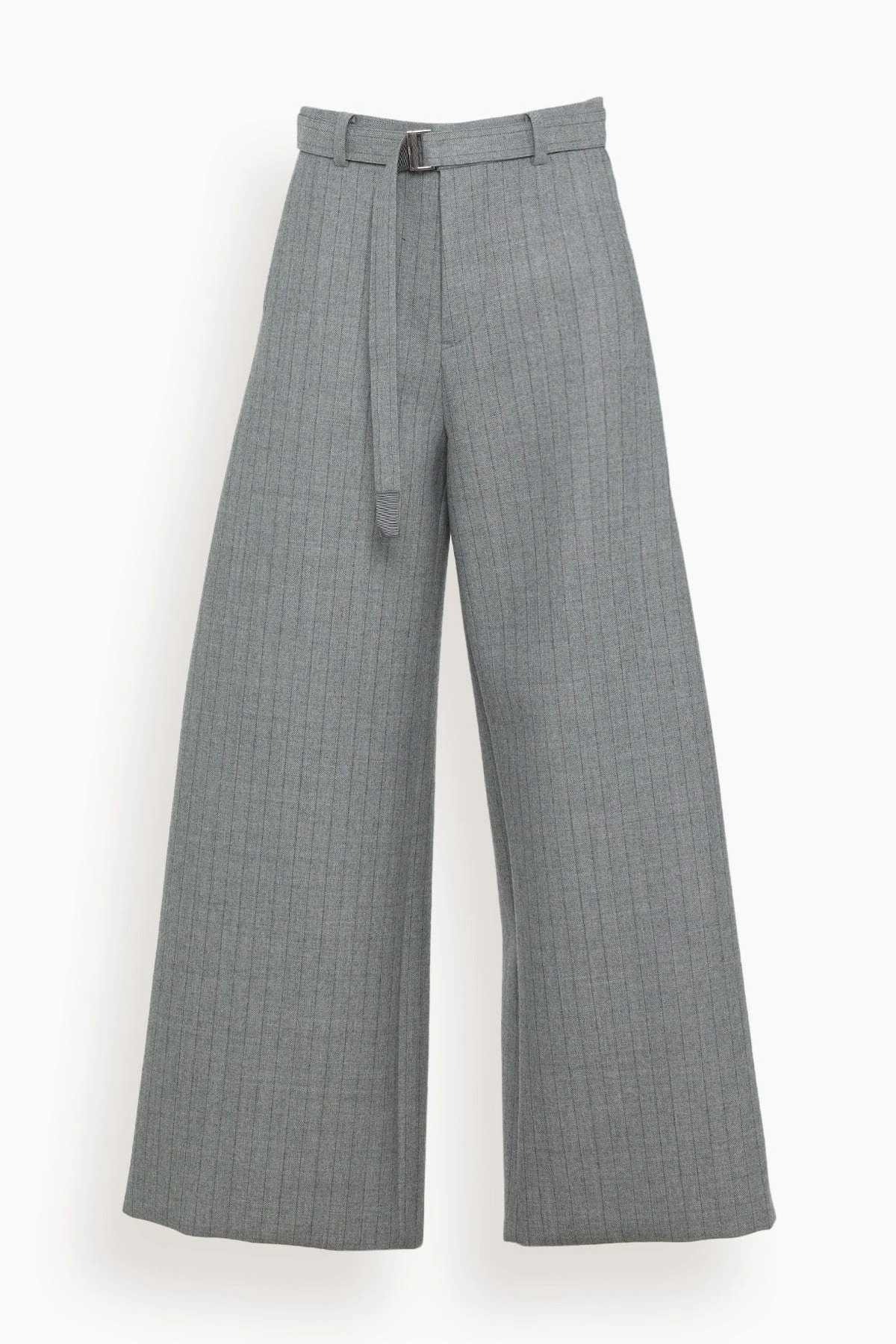 The Sacai Chalk Stripe Bonding Pants in Gray feature a classic pinstripe with a wide leg and belted waist. We love these paired with a fitted knit top and loafers.