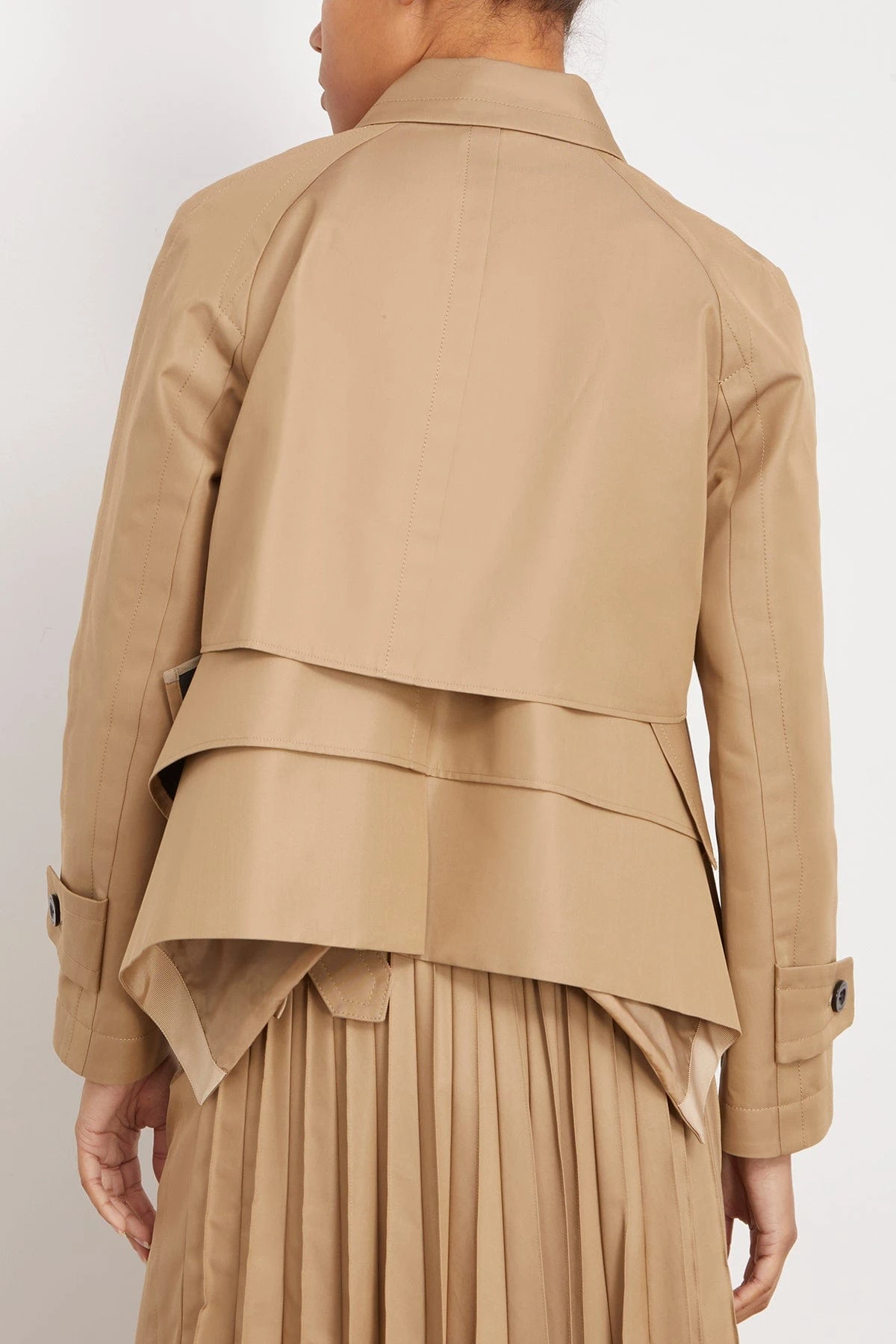 The Sacai Cotton Gabardine Blouson in Beige features a layered tiered design with concealed front button closure and cropped length. This piece features alayered blouson silhouette and is designed with archetypal trench details for a hybrid look.