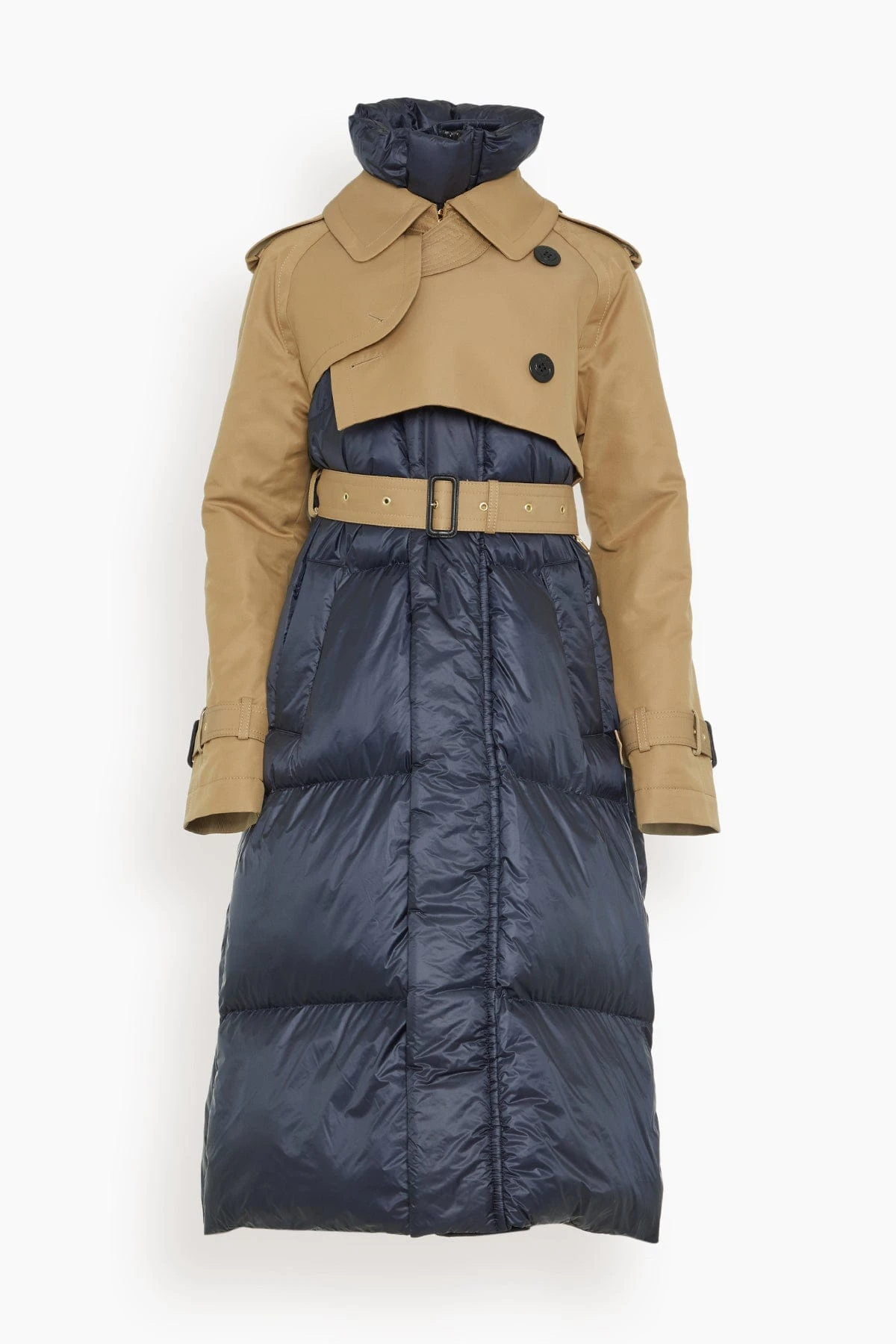 The Sacai Cotton Gabardine x Padded Coat is a must-have piece from their Fall 23 Collection. This trench coat features an oversized silhouette with a unique puffer bottom and belted waistband. Wear yours over a sweater and trousers.