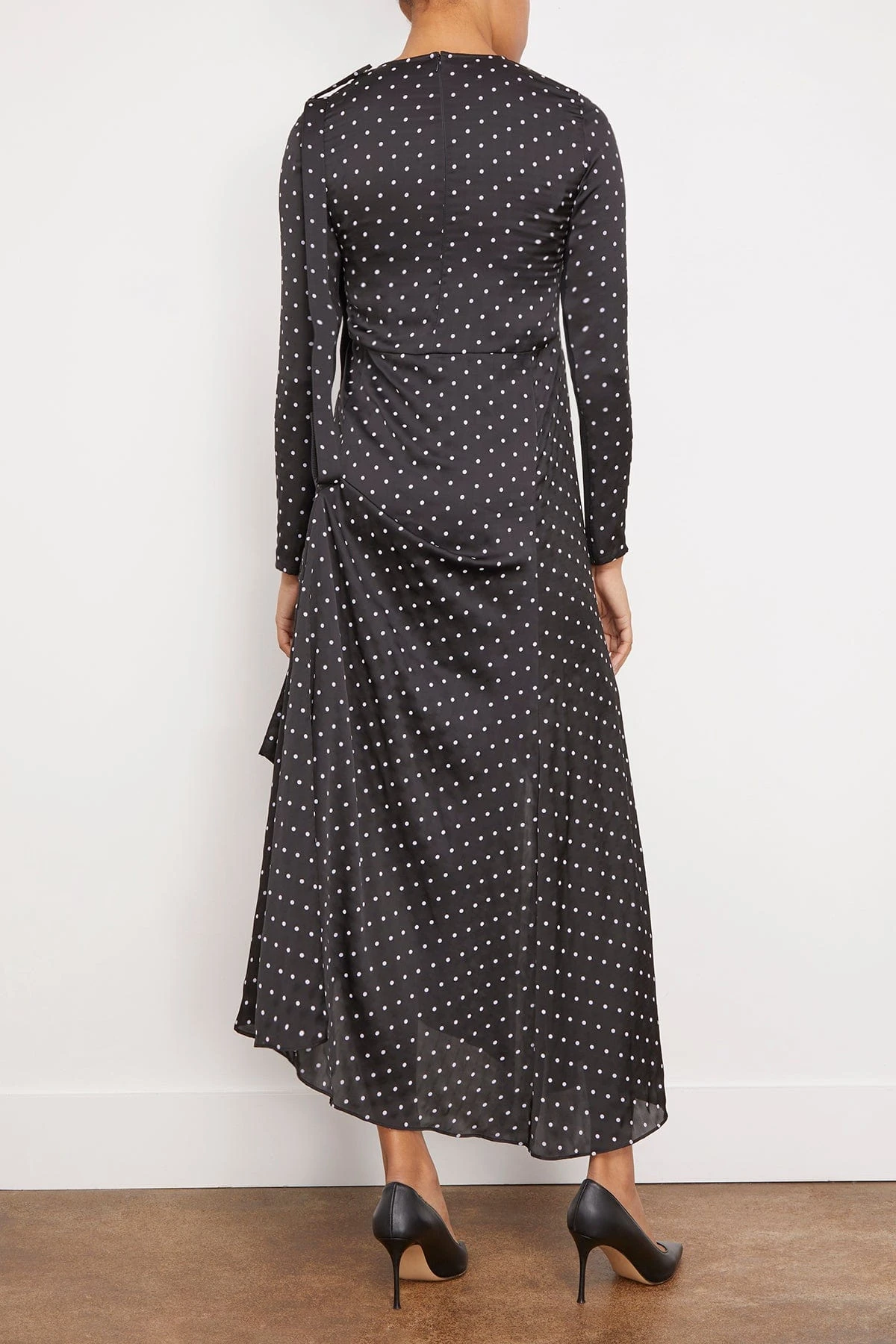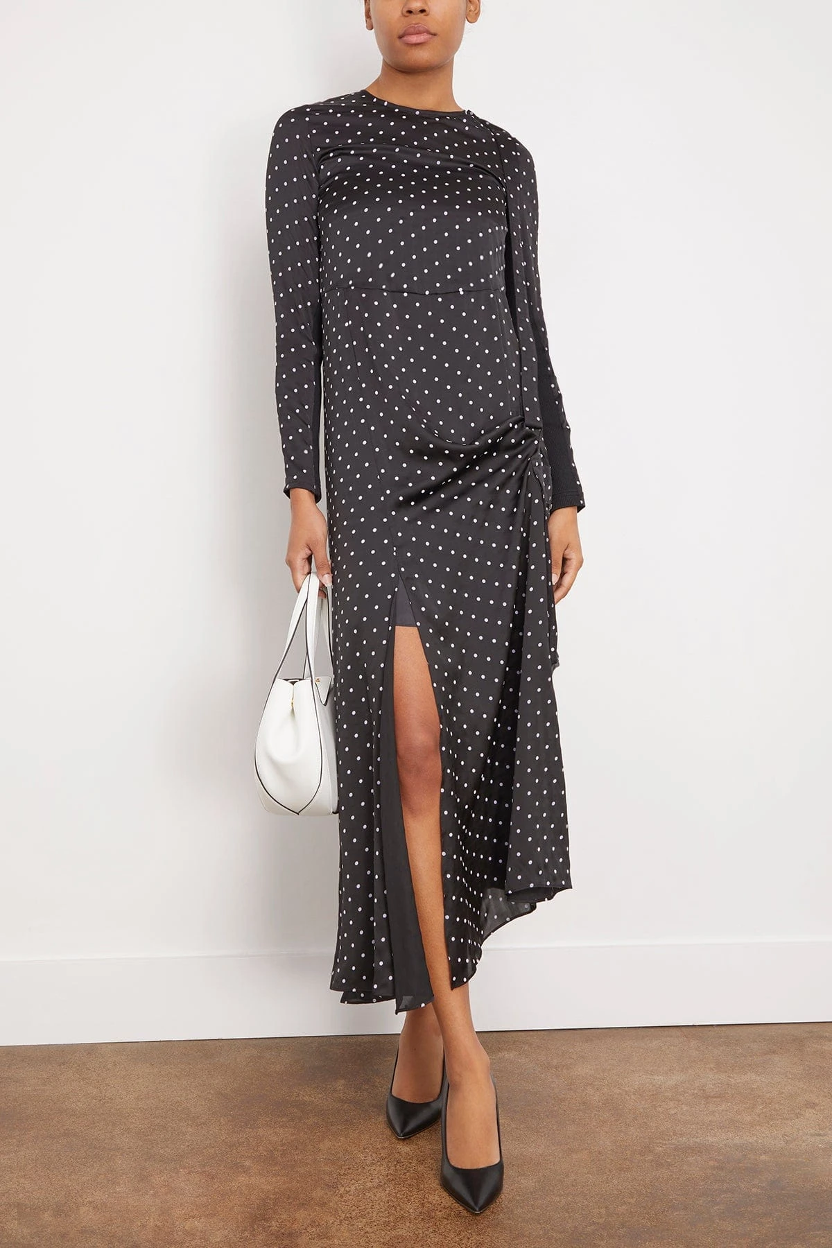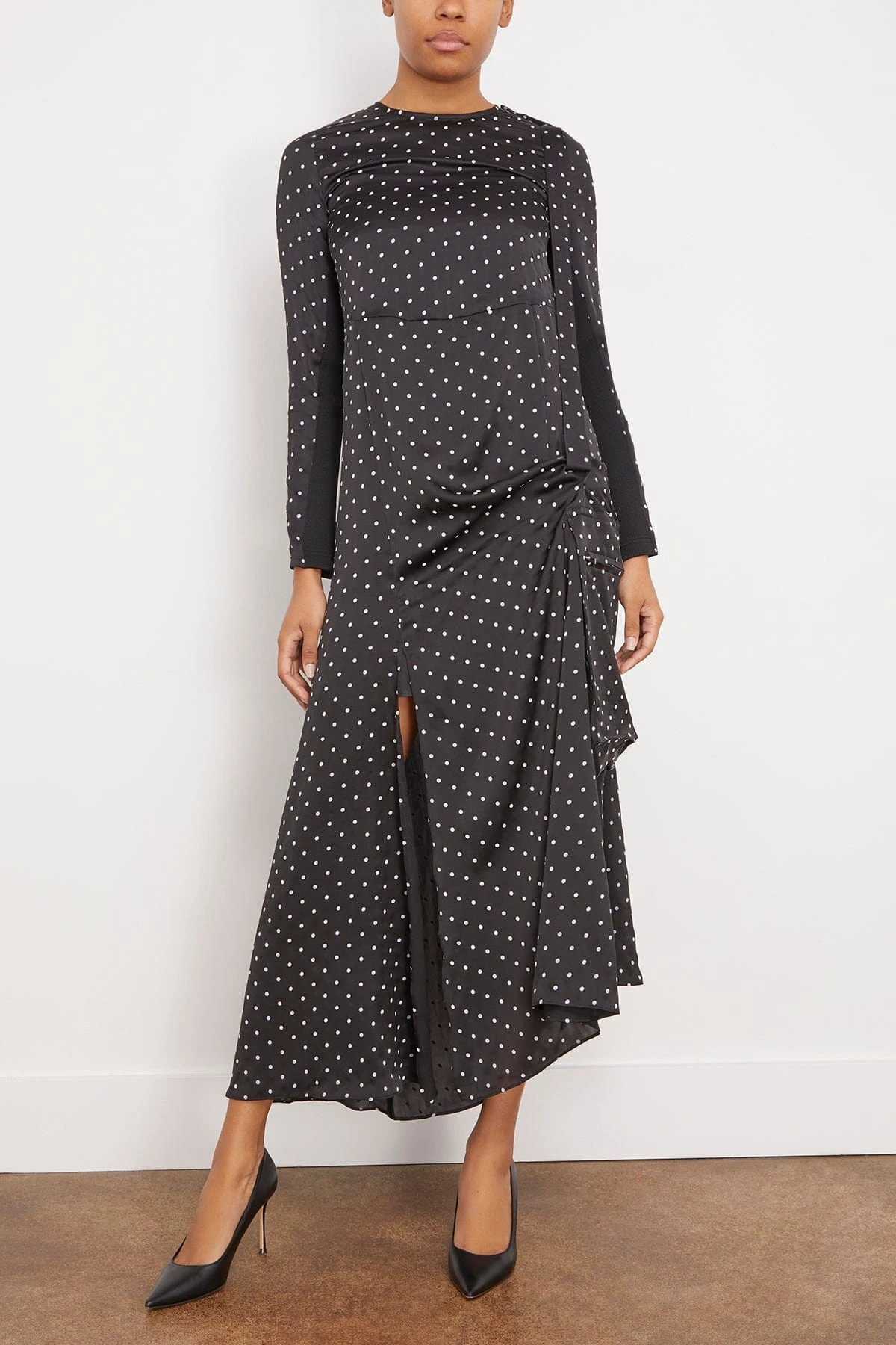 The Sacai Polka Dot Flock Print Dress in Black is going to be your favorite dress for this upcoming season. This dress features a polka dot print design with long sleeves, gathered detail at the side, and front slit. This style can be worn with flats and a clutch or dressed up with heels.