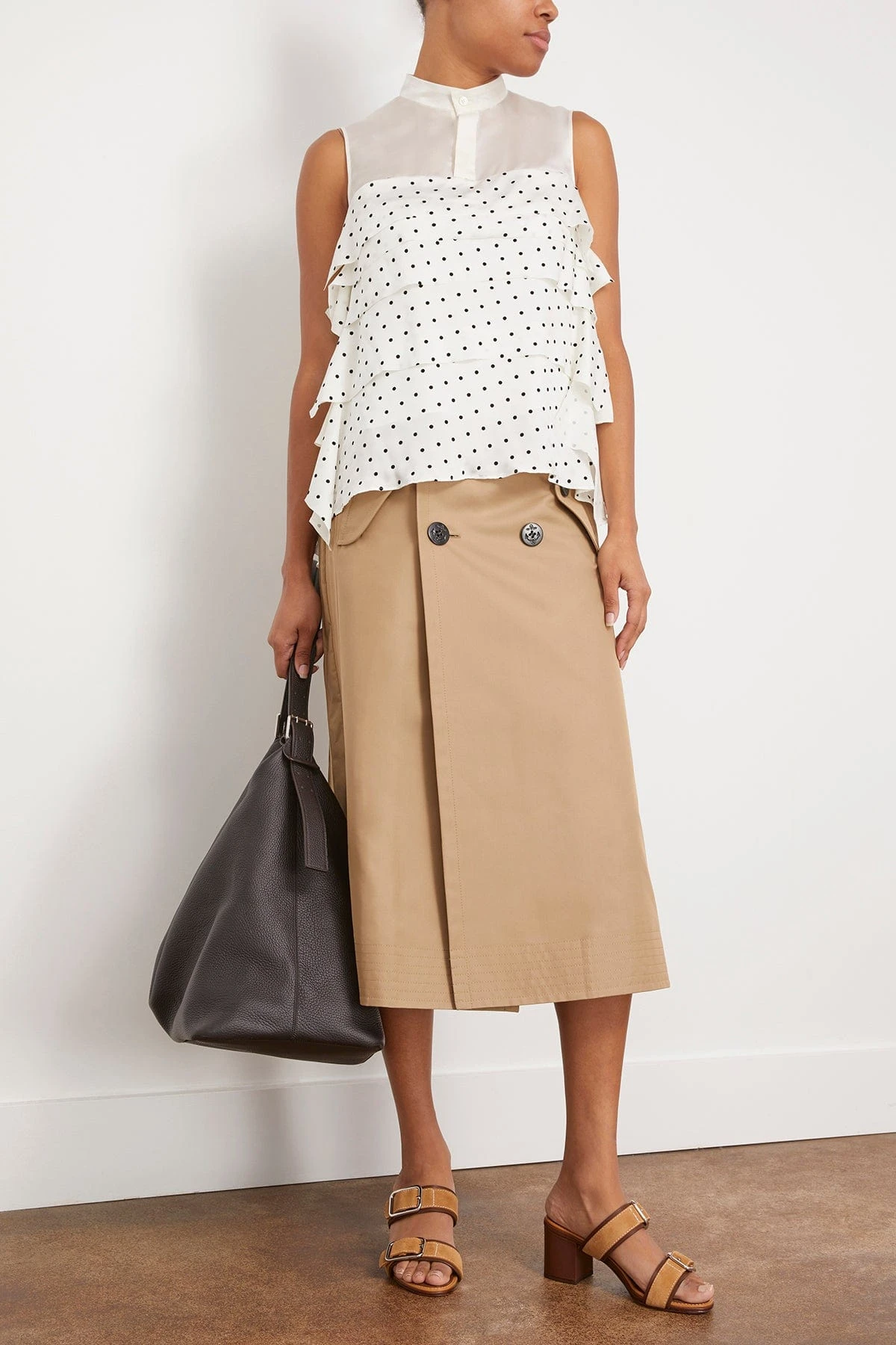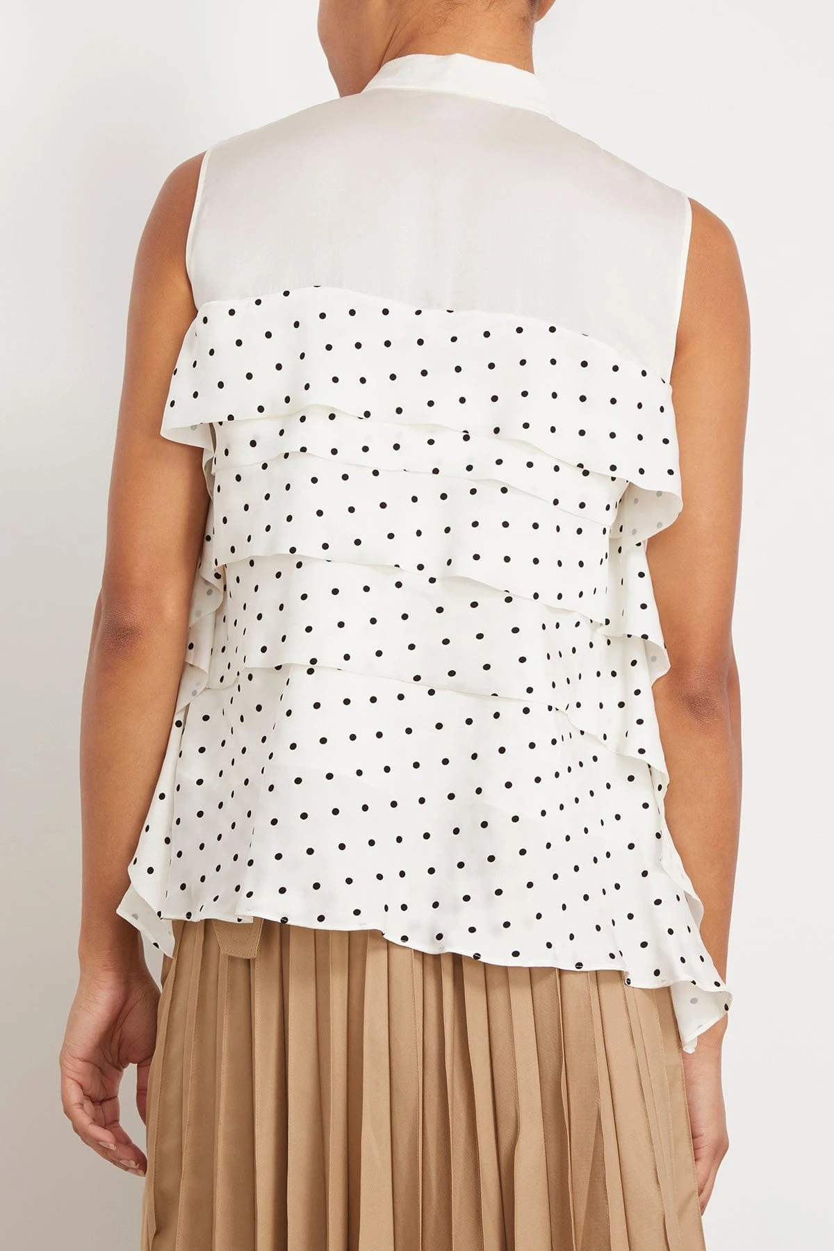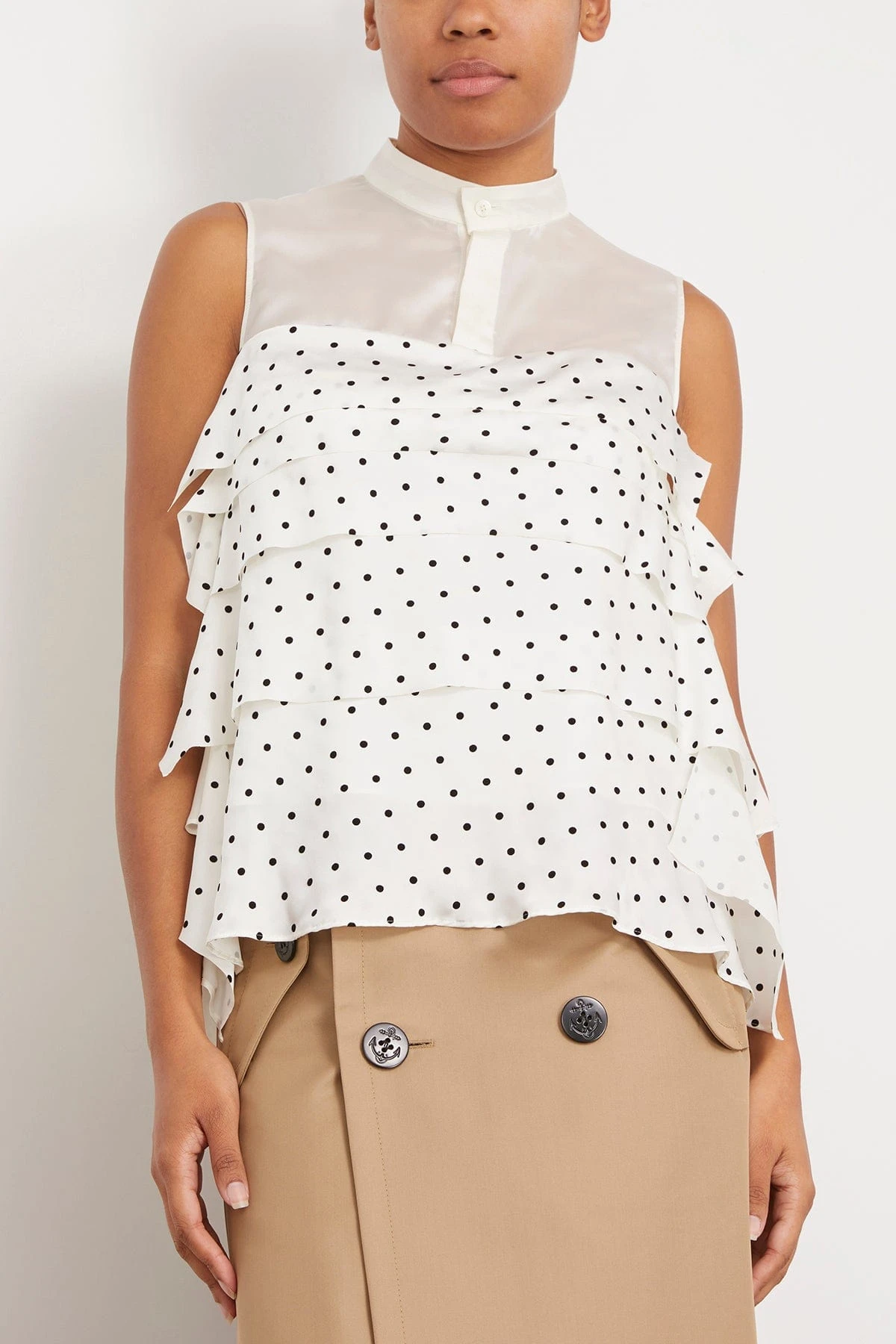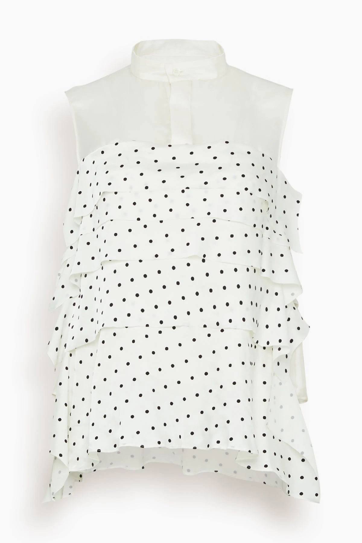 The Sacai Polka Dot Flock Print Pullover in Off White features a sleeveless design with polka dot print and tiered silhouette. We love this top worn with jeans and heels.