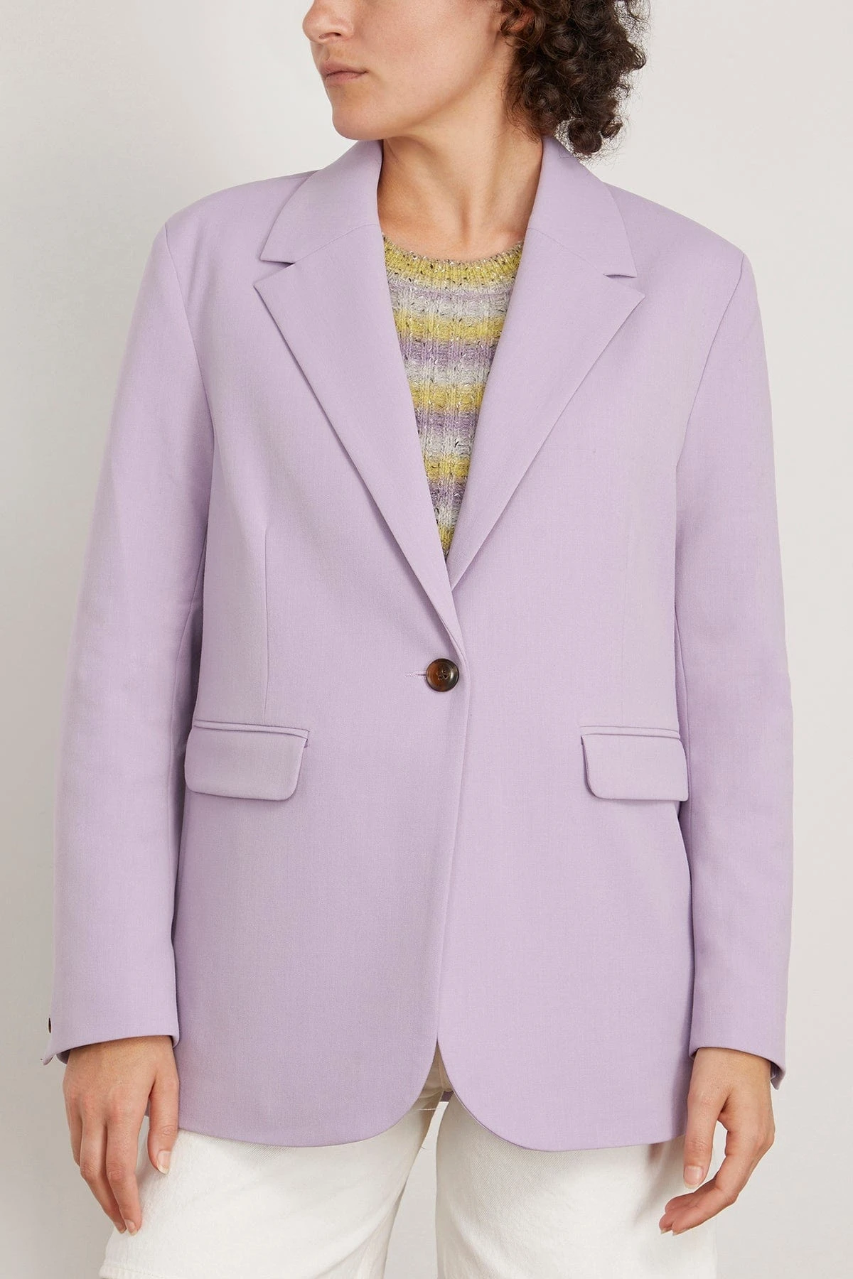The Samsoe Samsoe Haven Blazer in Rhapsody features an oversized fit in a classic single breasted design. It features a notched lapel collar, flapped front pockets and an inside pocket. The blazer also includes soft shoulder pads and is lined for added comfort. We love it paired withthe matching trousers and loafers.