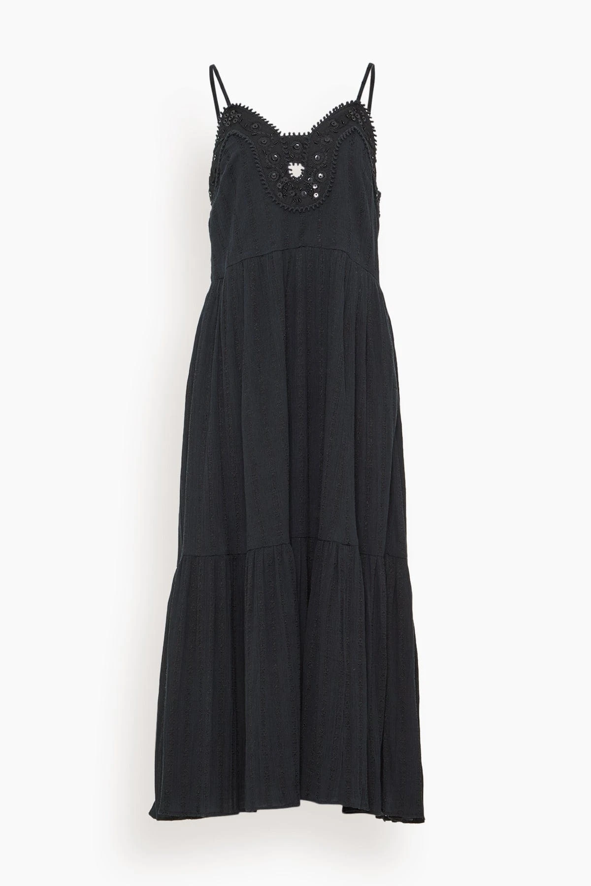 The Sea Charlotte Embroidered Sleeveless Dress in Black features embroidered eyelet detail at the bodice, tiered full skirt, and sleeveless design.