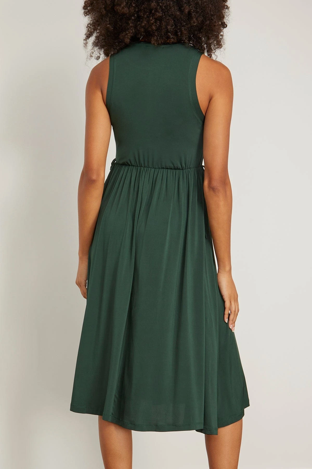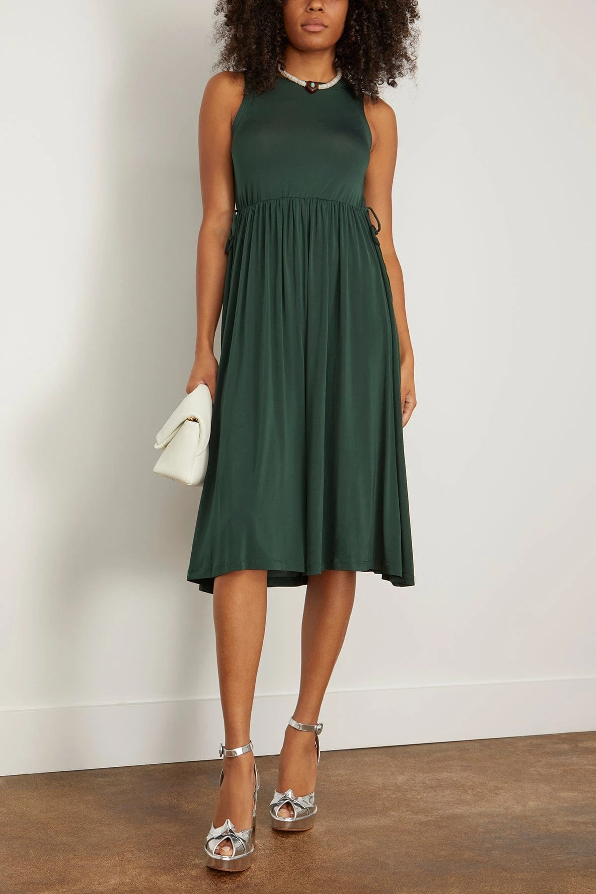The Ulla Johnson Clea Dress in Cypress is crafted from our lightweight tricot jersey in a rich forest green. This sleeveless midi dress features a crewneck and falls to an elegant midi silhouette with delicate adjustable ties for definition. We love it paired with boots and a jean jacket.