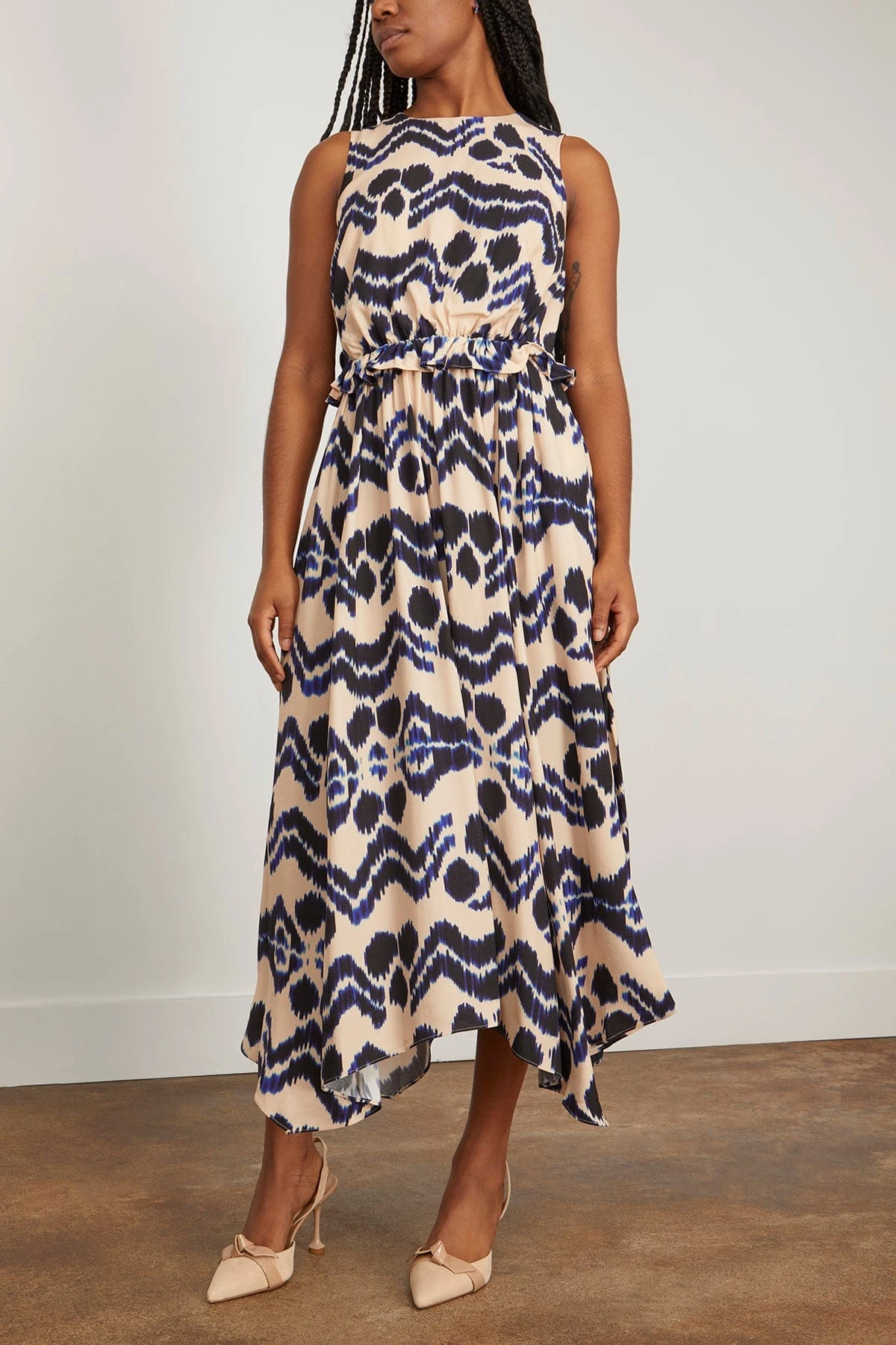 The Ulla Johnson Evita Dress in Nimbus is made from Ulla Johnson’s signature satin back crepe. It features a striking ikat motif with electric blue graphics against a peach background. This sleeveless dress has flattering ruffled peplum waist before cascading to an elegant midi handkerchief hemline. It has a concealed zip closure at the back.