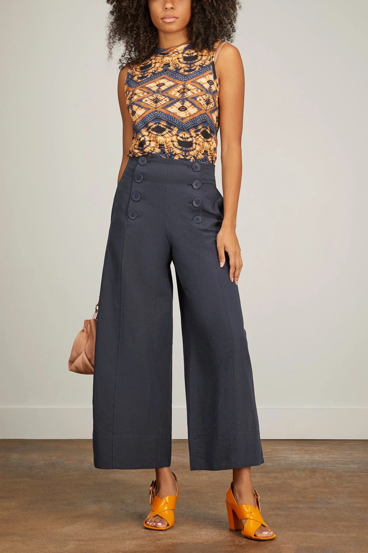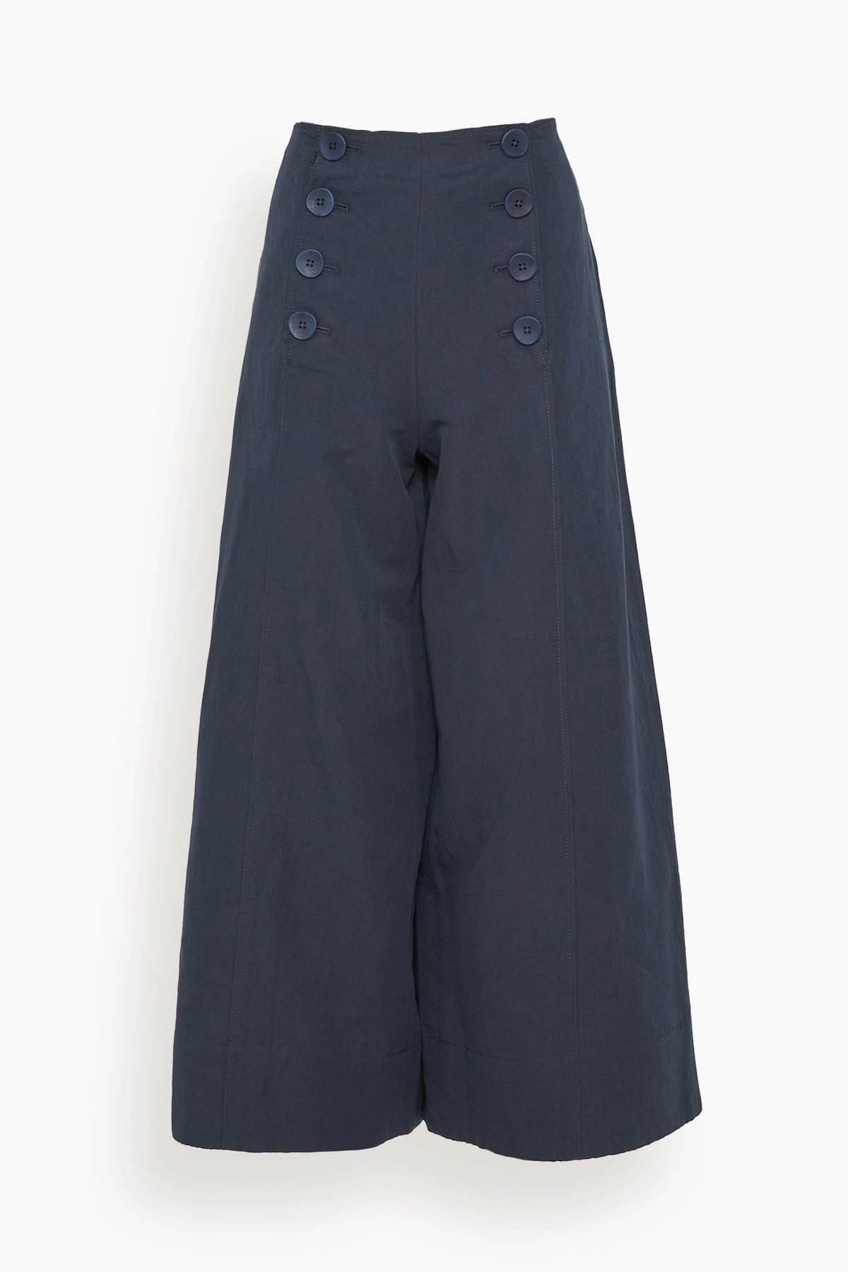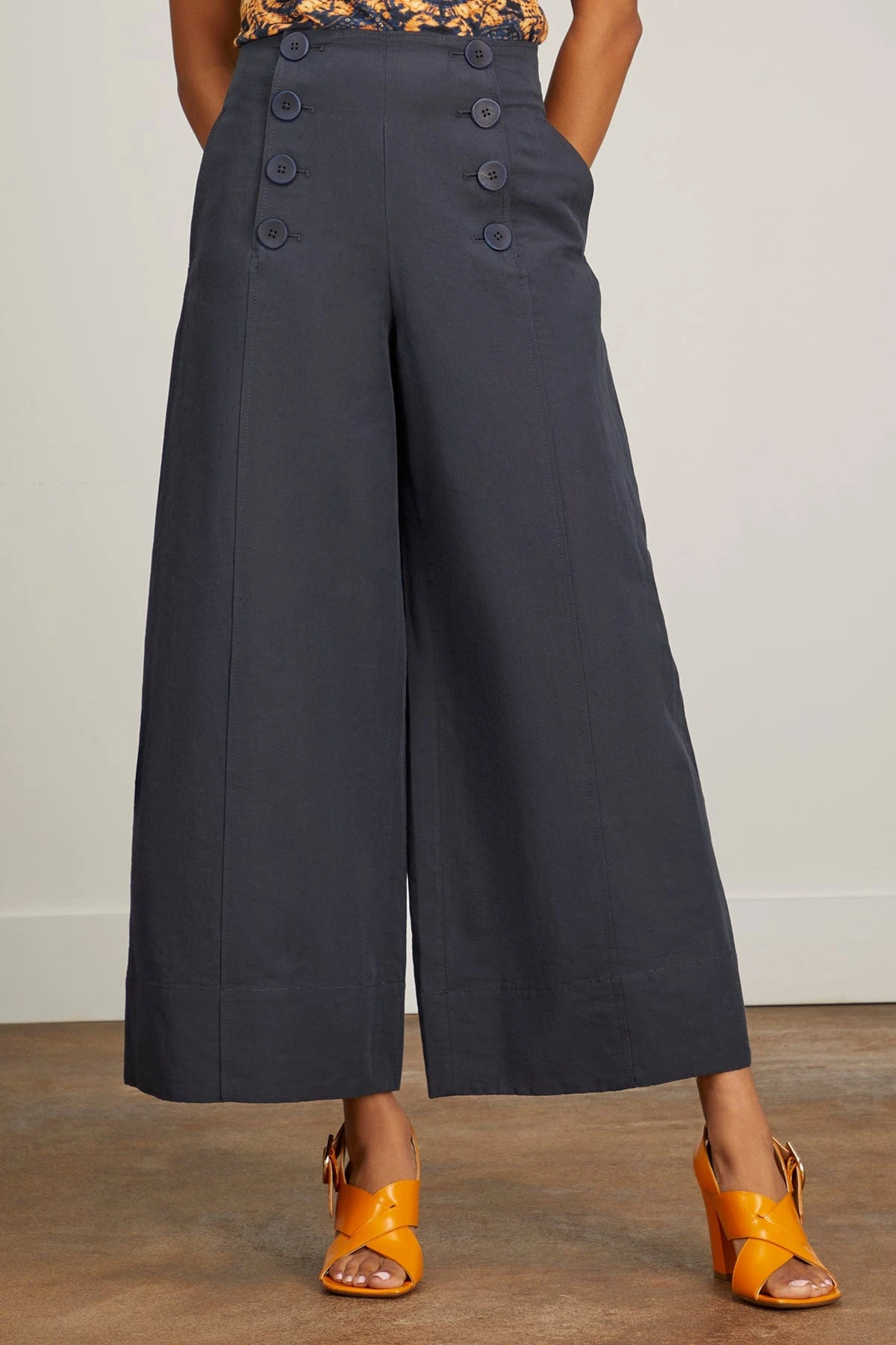The Polina Pants are crafted from our luxurious slub suiting, which combines silk, linen, and cotton fibers to create a lightweight fabric with a rich texture. These ultra-elegant navy blue pants sit high at the waist and are adorned by a double row of buttons along the front. This relaxed, wide-leg silhouette is finished with side-seam pockets.
